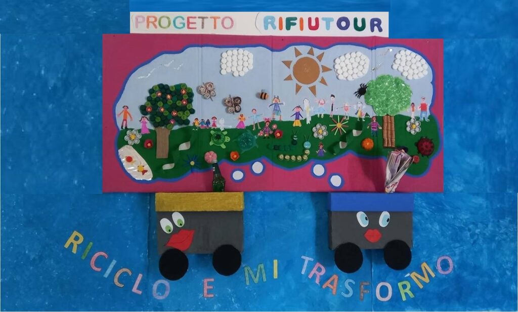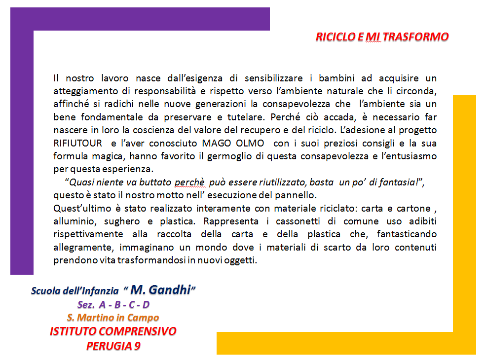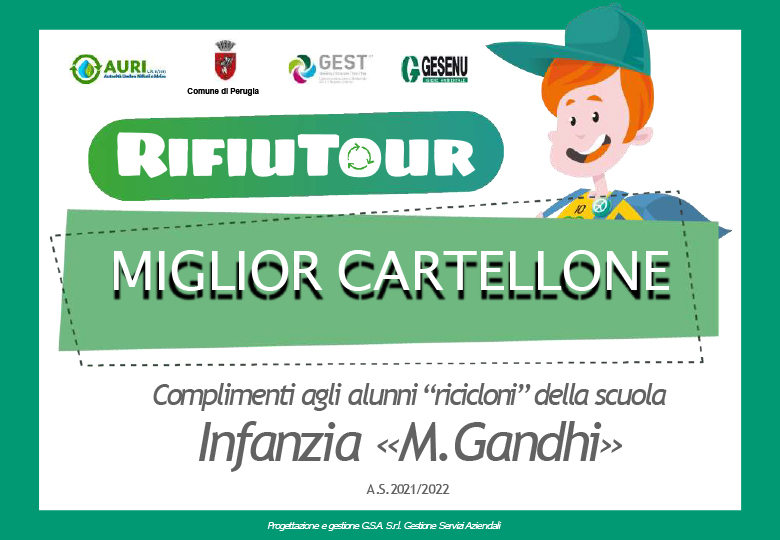 La SCUOLA DELL’INFANZIA GANDHI di S.Martino in Campo nei mesi scorsi ha partecipato prima ad un progetto svolto interamente on-line e successivamente ad un concorso indetto dalla GESENU con il patrocinio del Comune di Perugia sull’educazione ambientale denominato RIFIUTOUR . In merito a quest’ultimo i bambini sono stati invitati, supportati dalle insegnanti, a spaziare con la fantasia e trasformare dei rifiuti comuni in nuovi oggetti o animali, nasce così il pannello ” RICICLO E MI TRASFORMO”. I piccoli artisti inoltre si sono cimentati anche nella stesura di una breve composizione poetica a tema riciclo: Domani io sarò.La GESENU ha ritenuto altamente meritevole il lavoro svolto tanto da attribuire all’elaborato il premio come MIGLIOR CARTELLONE della categoria, elargendo anche un premio in denaro.