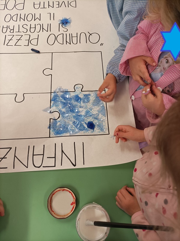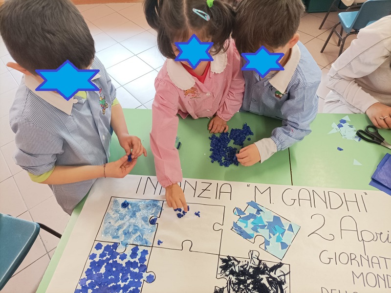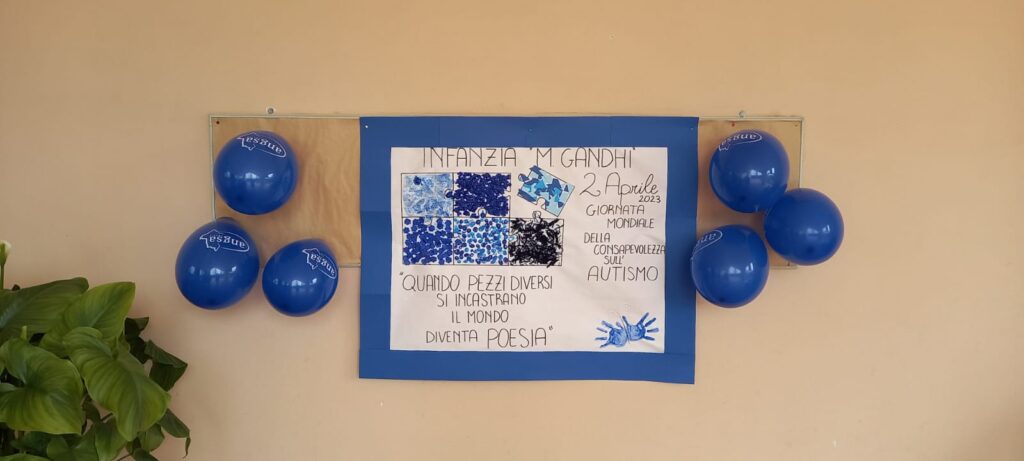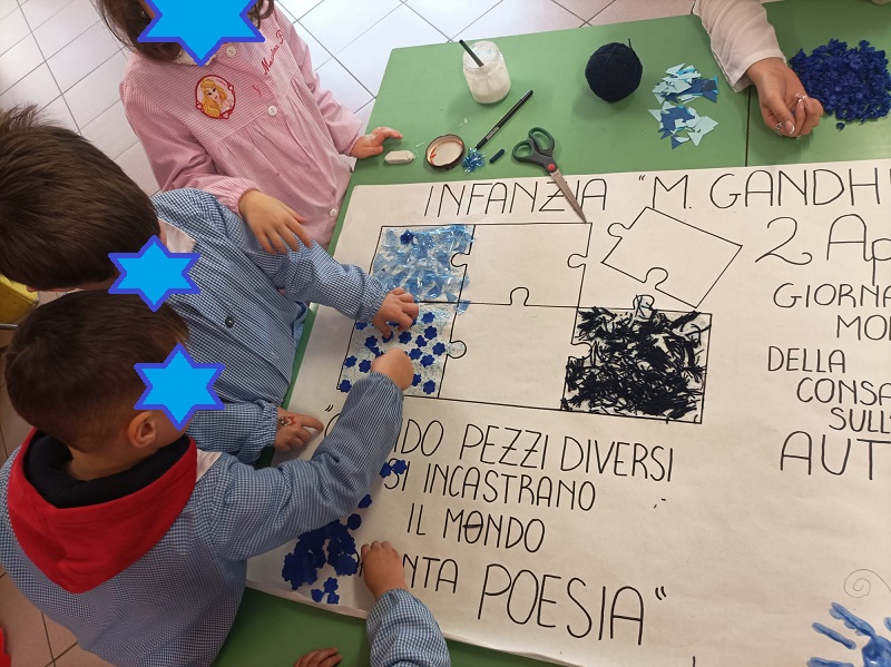 I bambini della scuola dell’infanzia Gandhi di S.Martino in Campo, attraverso un’attività laboratoriale di gruppo, hanno  promosso la GIORNATA MONDIALE DELLA CONSAPEVOLEZZA SULL’AUTISMO. E’ stata un’occasione per favorire l’inclusione, l’accettazione e il sostegno verso chi apparentemente è diverso da noi. L’attività è stata caratterizzata dall’uso del colore blu e dall’immagine del puzzle che simboleggia la complessità dell’autismo.