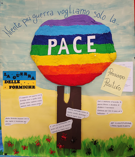 I bambini e le bambine della scuola dell’infanzia di Montebello sono stati guidati a riflettere sui valori della pace grazie al tempo del cerchio (Pensiamo Positivo), dal quale è emerso, forte e chiaro, il loro grido di pace: “Niente più guerra vogliamo solo la pace!”
